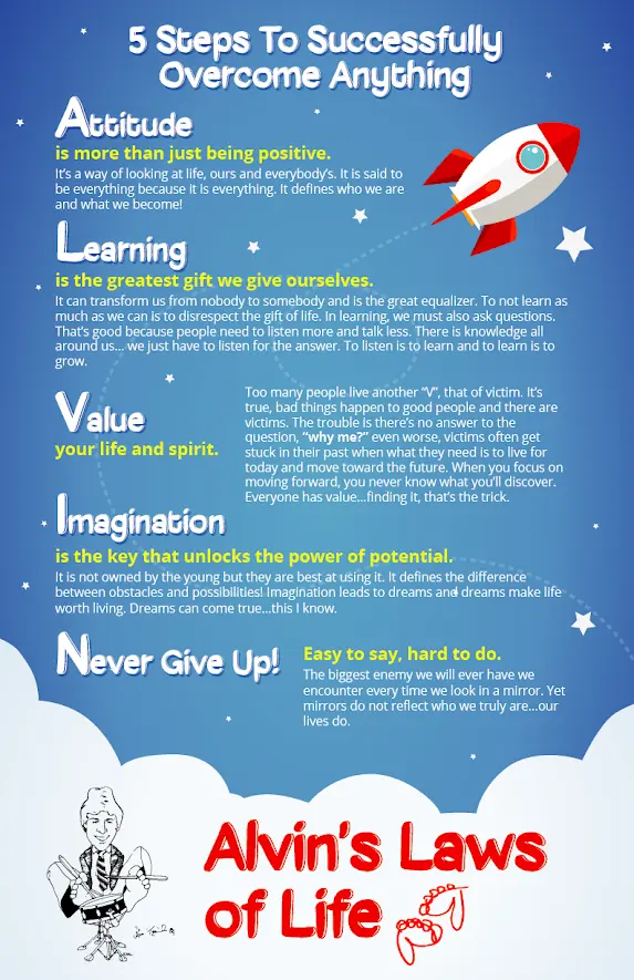 My mission statement was inspired from my international best-selling book: “Alvin’s Laws of Life… 5 Steps to Successfully Overcome Anything!” The book’s theme is inspired by my “Laws,” which I wrote a few years earlier. Here they are: